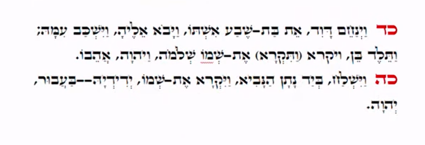 9:24 וינחם דוד את בת שבע אשתו, ויבוא אליה, וישכב עמה; ותלד בן, ויקרא את – שמו שלמה, והוויה אהבו. וישלח, ביד נתן הנביא, ויקרא את – שמו ידידיה — בעבור, הווייה.