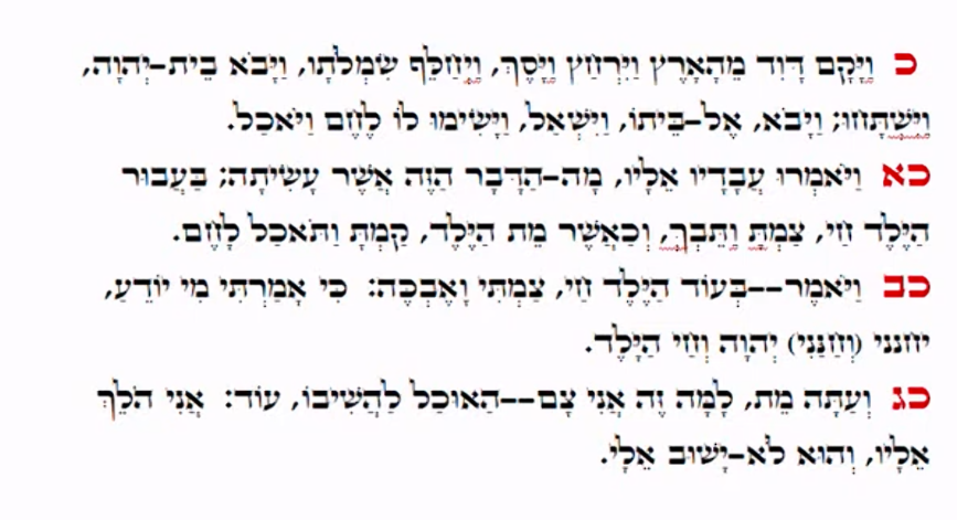 8:58 ויאמרו עבדיו אליו, מה הדבר הזה אשר עשיתה; בעבור הילד חי (כשהוא היה חי הילד) צמת ותבך, וכאשר מת הילד, קמת ותאכל לחם. ויאמר — בעוד הילד חי, צמתי ואבכה: כי אמרתי מי יודע, יחנני הויה וחי הילד. ועתה מת, למה זה אני צם — האוכל להשיבו, עוד: אני הולך אליו והוא לא – ישוב אלי.