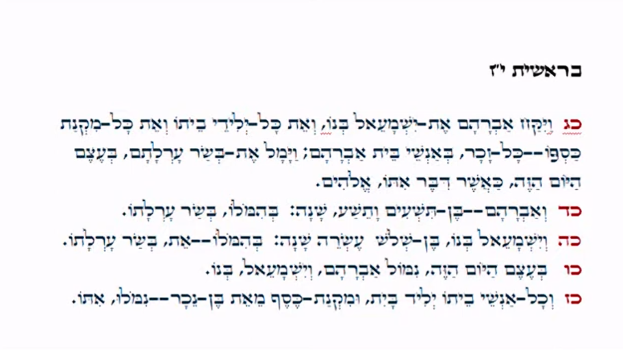 3:26 אז הנה לפניכם… אז אלוהים פונה אליו יש לו בינתיים רק את הילד האחד את ישמעאל, ויחד עם ישמעאל הנה אנחנו קוראים כאן. ואברהם בן 99 שנה בהמולת וישמעאל בנו בן 13 שנה והימולו את בשר עורלתו בעצם היום הזה נמול אברהם וישמעאל בנו וכל אנשי ביתו יליד בית ומקנת כסף מאת בן נחר נמולו איתו.
