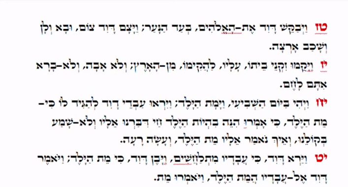 8:05 ויבקש דוד את האלוהים בעד הנער, ויצום דוד צום, ובא ולן ושכב ארצה. ויקומו זקני ביתו, עליו, להקימו מן הארץ; ולא אבה, ולא ברא איתם לחם. ויהי ביום השביעי, וימת הילד; וייראו עבדי דוד להגיד לו כי מת הילד, כי אמרו הנה בהיות הילד חחי דיברנו אליו ולא – שמע בקולינו, ואיך נאמר אליו מת הילד, ועשה רעה (הוא התאבד).