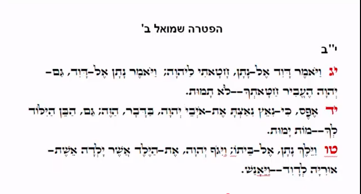 7:33 ואז ויאמר נתן אל דוד . ויאמר דוד אל נתן חטאתי להוויה (לאותה הווייה שבראה את העולם גן עדן לאותה הווייה שאנחנו מחויבים בתיקון עולם לפניה.) ויאמר נתן אל דוד גם הווייה העביר חטאך לא תמות. אפס, כי נאץ נאצת את אויבי הווייה, בדבר הזה, גם הבן הילוד לך מות ימות. ויילך נתן אל ביתו, ויגוף הוייה, את הילד אשר ילדה אשת אוריה לדוד ויאנש (שניהיה חולה אנוש).